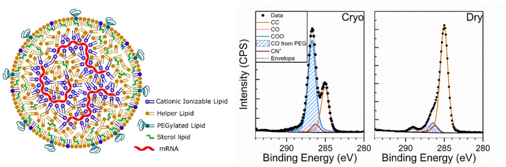 These results are very encouraging and ongoing work aims to extract information on lipid composition from mass spectra of individual liposomes. The potential outcome of this work is highly significant, because while the average bulk composition of liposomes or lipid nanoparticles can be determined with techniques like chromatography, the compositional variation between individual particles is largely unknown. These advancements in ToF-SIMS mark a significant step forward. Complementing these efforts, cryogenic XPS further enhances our ability to analyze and understand these complex systems.