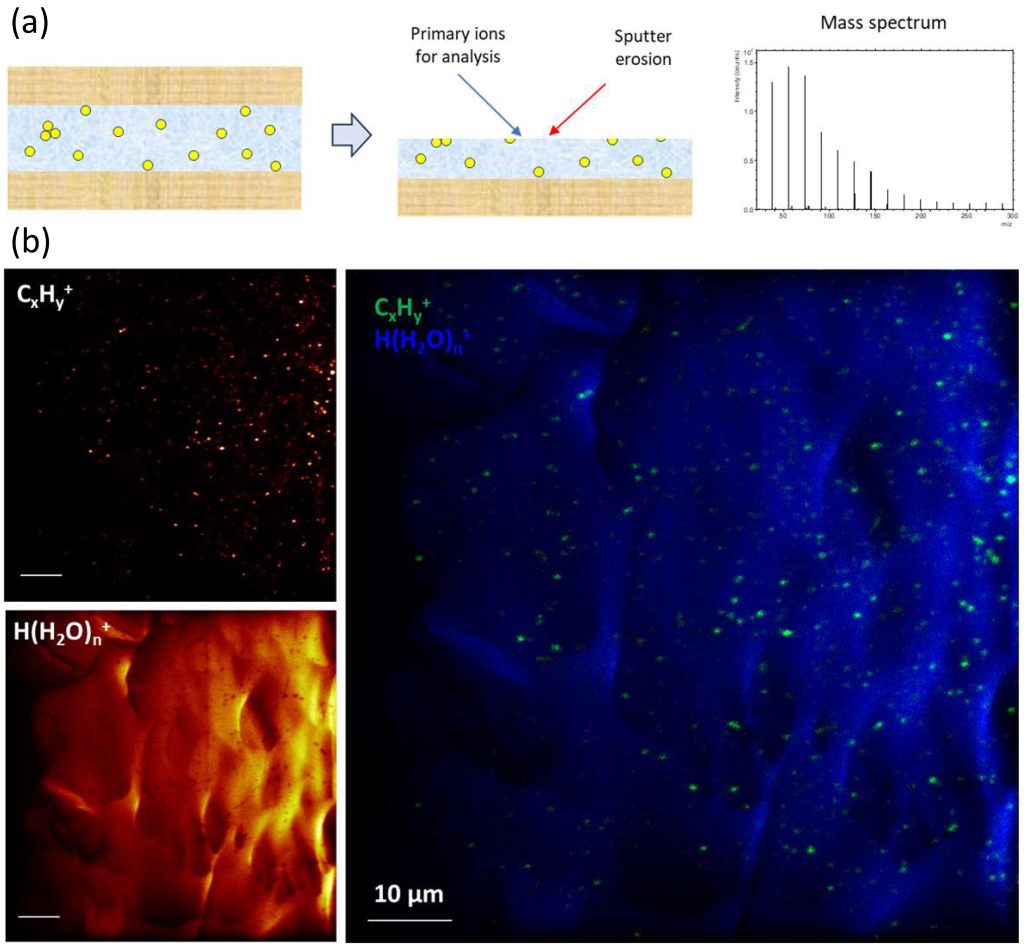 In ToF-SIMS, mass spectra of surface molecular species are generated at sub-micron spatial resolution, allowing the mapping of specific molecules on the sample surface and measurements of the molecular composition of surface structures down to the sub-µm size range.
