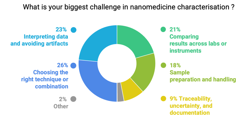 The audience responses to the live polls confirmed a reality of nanomedicine research and development : method choice is rarely the bottleneck alone. It is the combination of sample preparation, interpretation, and comparability that makes characterisation hard, as highlighted by the poll results to the question What is currently your biggest challenge in nanomedicine characterisation: