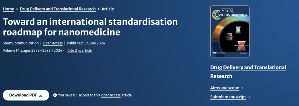 A recent publication in Drug Delivery and Translational Research by Caputo, F. et al. (2024), titled “Toward an International Standardisation Roadmap for Nanomedicine“, highlights the urgent need for harmonised test methods and reference materials to support the clinical translation of nanomedicines. This work aligns closely with the objectives of the MetrINo project, which aims to establish robust metrological frameworks for nanotherapeutics.